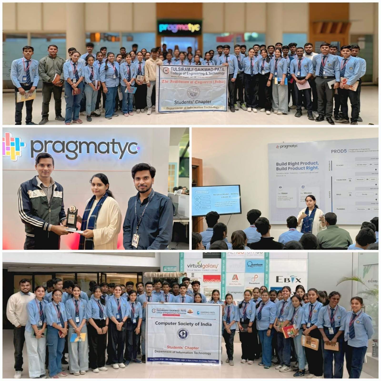 The Information Technology Department of Tulsiramji Gaikwad-Patil College of Engineering and Technology, Nagpur, recently organized a One-Day Industrial Visit for B.Tech VI Semester students at Pragmatyc, MIHAN, Nagpur. The visit was planned to provide students with real-world exposure to software development management, corporate work culture, and placement-oriented applications.