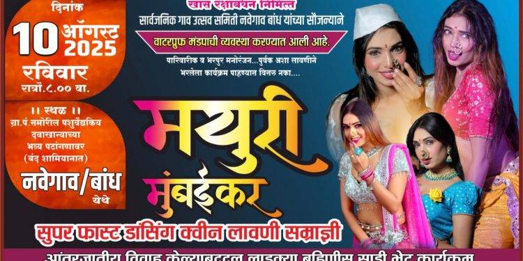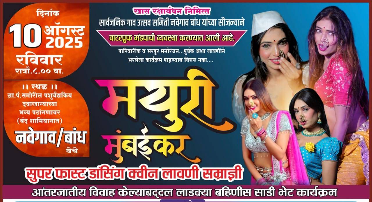 १० ऑगस्ट रोज रविवारला रक्षाबंधनाच्या सणाचे औचित्य साधून रात्री ८.०० वाजता येथील ग्रामपंचायत समोरील पशुवैद्यकीय दवाखान्याच्या भव्य पटांगणावर लाडक्या बहिणींसाठी, त्यांच्या मनोरंजनासाठी सुपरफास्ट डान्सिंग क्वीन,लावणी सम्राज्ञी मयुरी मुंबईकर यांच्या ग्रुपचा पारिवारिक व मराठमोळ्या लावण्यांचा बहारदार कार्यक्रम आयोजित करण्यात आला आहे.